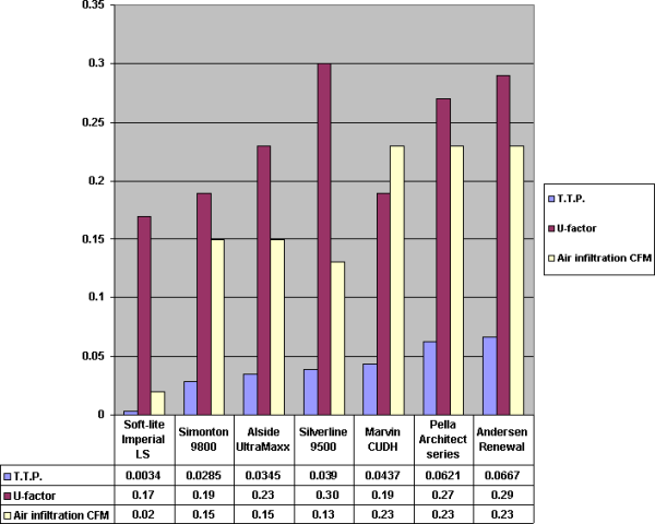 All data is shown with the best possible U-factor’s available on double hungs; some of these numbers come from optional glass packages. The air infiltration is what would be standard and can not be upgraded. When a manufacturer lists different air infiltration numbers the average air infiltration is listed. All data was taken as of 2011.